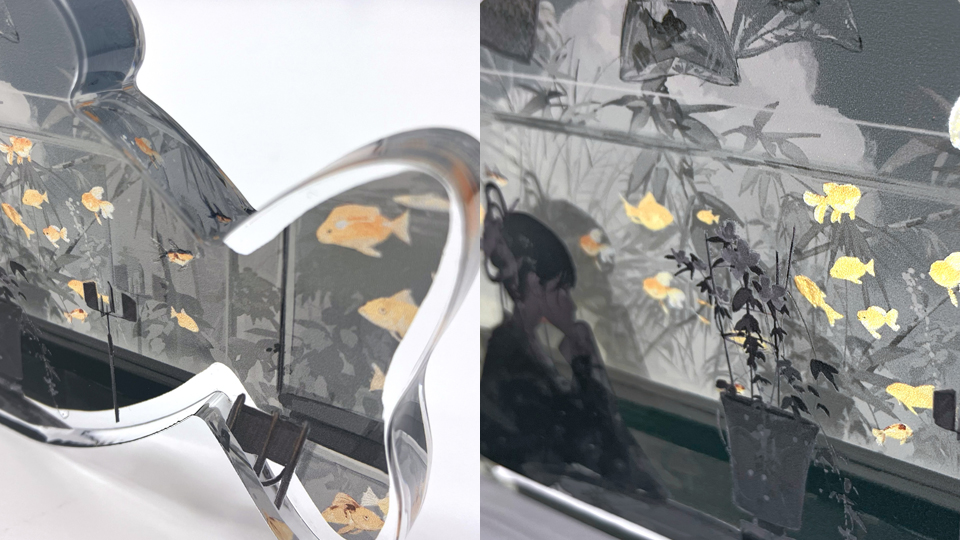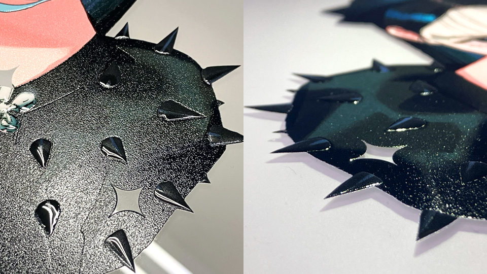 透明な用紙にプリントし、背景に銀ラメアクリルを仕込むとラメラメに!